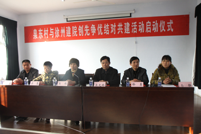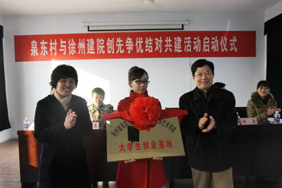 在启动仪式上,校党委副书记吴光林和徐州贾汪镇镇长吴伟共同为建筑装饰艺术学院“党员服务基地”、“学生社团实践基地”和“大学生创业基地”揭牌,建筑装饰艺术学院党总支书记梁惠和泉东村党总支书记朱兴亚签订共建协议。吴伟镇长致欢迎辞,对校地共建活动表示热烈祝贺,吴光林副书记在讲话中说,开展结对共建活动是建筑装饰艺术学院认真贯彻落实党的十七届四中、五中全会精神,深入开展创先争优活动的重要部署和具体举措,要开展好结对共建活动,必须抓好以下几点:一是要加强沟通,找准共建工作的切入点;二是要精心组织,实现结对双方互利双赢;三是要建立机制,推动长期共建合作。