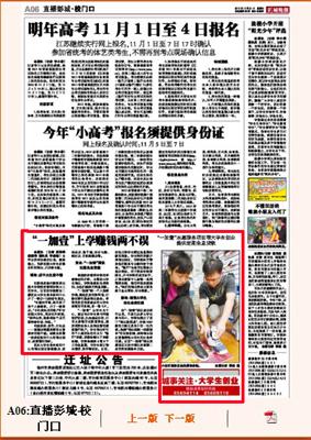 10月21日的《彭城晚报》A06版以《“一加壹”上学赚钱两不误》为题对MK(中国)经管学院大学生创业志愿服务活动进行报道。“一加壹”创业志愿服务活动在MK(中国)大学生创业氛围的影响下,开展了一个人加壹份钱,实现学生自主创业,志愿服务回报社会的活动。
