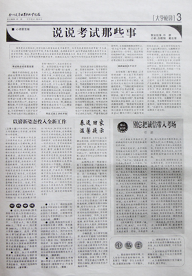 为了严肃考风考纪,教务处专门成立了巡查组,负责各教学楼层考场巡查,处理突发事件。宣传部也加强考试氛围的营造,在各教学楼前挂上诚信考试宣传标语,并在校报刊登了多篇诚信考试相关文章。
