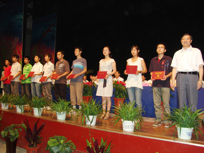 王旭善向十个系(院)的毕业生代表颁发毕业证书