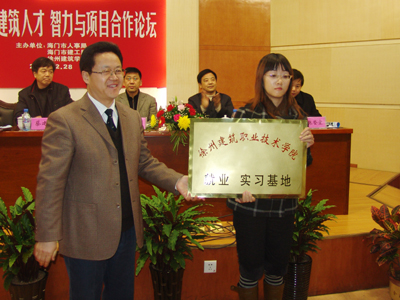 会上,海门市人事局局长蔡建新介绍了海门市发展现状,海门市建筑工程管理局局长刘亚珍介绍了海门市建筑业发展概况,我院院长袁洪志致欢迎词并介绍了我院的有关情况,徐州市人才服务中心主任王涛就近几年来我院毕业生的就业情况作了介绍,大家还一起观看了海门市和我院的专题宣传片。