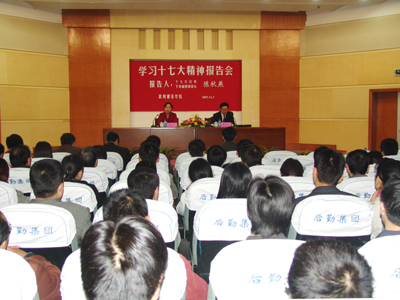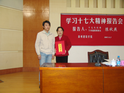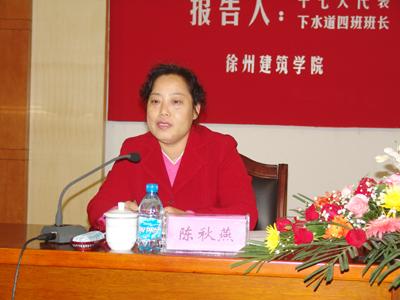 回忆起十七大期间,胡锦涛总书记对下水道四班的关怀,朴实的陈秋燕同志依然十分动情,报告一开场,就激动地传达了胡锦涛总书记在江苏代表团讨论时对下水道四班的亲切嘱托,使聆听者充分感受到总书记对基层群众的关爱,一下就使报告会现场的气氛热烈了起来。随后,陈秋燕同志介绍了党的十七大召开的盛况,传达了十七大报告的主要内容和主要精神,此外,还介绍了下水道四班的工作近况。报告语言朴实,内容丰富,使与会师生深受鼓舞和教育。听完报告,师生们纷纷认为,从陈艳秋同志的报告中,充分感受到党和人民的鱼水之情,既加深了对十七大精神的理解,也提高了学习贯彻的自觉性,清醒地认识到作为一名党员,思想要始终与党中央保持高度一致,要在自己的岗位上以实际的行动切实把十七大精神学习好、贯彻好、落实好。