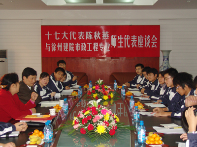 报告会后,陈秋燕与我院市政工程专业教师和学生代表进行了座谈交流。院党委副书记吴光林主持了座谈会。座谈会上,陈秋燕勉励我院青年学生要树立正确的人生观和价值观,树立坚定的共产主义信念和报效祖国的远大理想,脚踏实地,努力在平凡的岗位上做出不平凡的业绩。陈秋燕还欣然接受市政工程专业学生的邀请,担任起他们的校外辅导员。