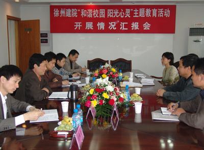 10月22日,徐州市“和谐校园 阳光心灵”主题教育活动督察组一行四人对我院“和谐校园 阳光心灵”主题教育活动开展情况进行了检查。院党委副书记吴光林及相关部门负责同志接待了督察组。吴光林副书记就活动开展情况进行了汇报。