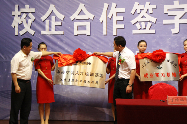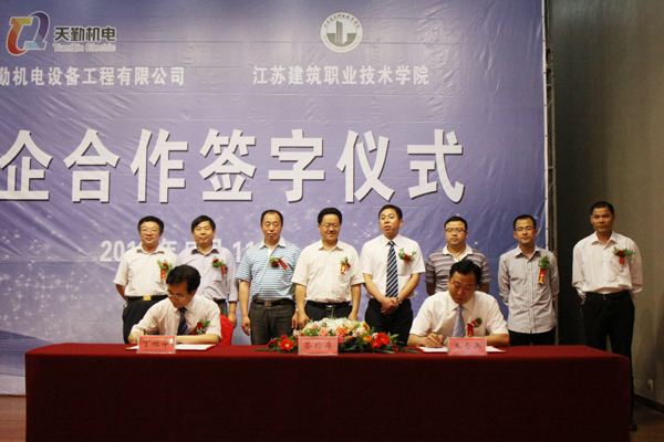 袁洪志、王雪峰共同为设在天勤机电的“MK.COM就业实习基地”和设在学校的“江苏天勤机电设备工程有限公司中央空调人才培训基地”揭牌;丁维华、王雪兵代表校企签署校企合作协议。同时举行了“天勤机电奖助学基金”捐赠仪式。