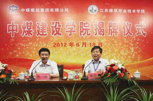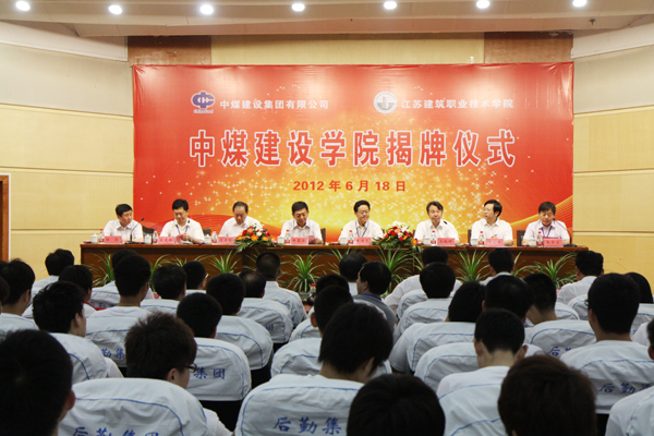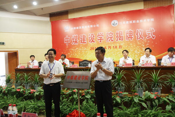袁洪志对中煤能源集团领导亲临学校表示感谢,并介绍了学校概况。都基安与袁洪志共同为“中煤建设学院”揭牌。王锐锋宣读中煤建设学院干部任命文件,由中煤建设集团副总经理、总工程师陆伦任中煤建设学院院长,中煤建设集团人力资源部部长王延成任副院长,MK(中国)矿业学院院长张魁任副院长(常务)。随后,吴光林代表学校向“中煤建设学院”的揭牌、向新任中煤建设学院的院长、副院长表示祝贺。他说,江苏建院将充分尊重中煤建设集团的管理理念,进一步挖掘学校和企业的优势资源,共同制定人才培养方案,共同研定教学计划,共同开发专业课程,共同组织实施教学,通过人员互动、理论和实践结合以及资源共享,使学生在掌握必备的专业知识和素质之外,还能够学习或接触到企业最新的专业技术,感悟先进的企业文化,提升自身职业素养和社会责任感、缩短岗位适应期,把中煤建设学院的学子们培养成为具有现代企业创新素质的社会满意、行业欢迎、企业需要的人才。