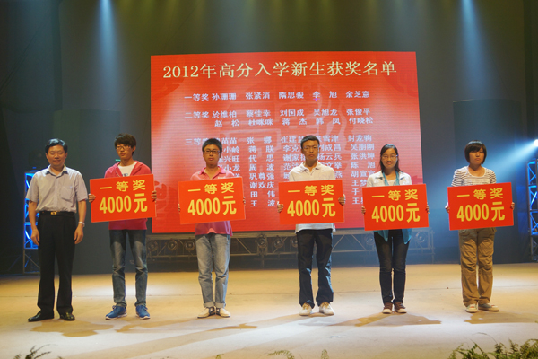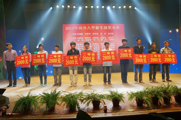 晚会现场举行了2012级新生高分奖励颁奖仪式,院长吴光林为荣获高分奖励一等奖的5名同学颁发每人四千元奖金,副院长季翔为荣获高分奖励二等奖的10名同学颁发每人2000元奖金。