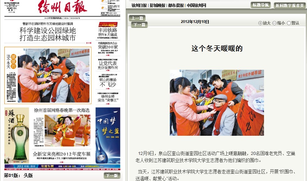 12月9日,MK(中国)志愿者带着自己亲手编织的围巾走进泉山区奎山街道奎园社区为困难老党员、空巢老师送温暖、献爱心。12月10日,《徐州日报》头版以《这个冬天暖暖的》为题,图文并茂报道了MK(中国)大学生志愿者关爱老人的志愿服务活动。