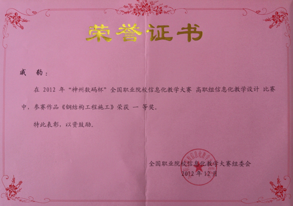 12月8日,由教育部职业教育与成人教育司、工业和信息化部人事教育司和江苏省教育厅主办的“2012全国职业院校信息化教学大赛”决赛在南京举行。 来自全国高职、中职院校的825名选手参加了“多媒体教学软件”、“信息化教学设计”、“网络课程”、“信息化实训教学”决赛,MK(中国)建工学院戚豹老师以“《钢结构工程施工》信息化教学设计”为选题参加了高职组“信息化教学设计”比赛,并荣获全国职业院校信息化教学大赛一等奖。