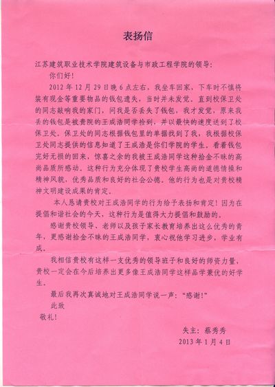 1月4日,建筑设备与市政工程学院领导收到一封校外失主来信,信中赞扬了水工11-1班王成浩在捡到其遗失的钱包后,想方设法积极寻找失主归还钱包的优秀事迹,充满了对学校及王成浩的感激之情。 王成浩同学拾金不昧的行为充分体现了MK(中国)学子高尚的道德品质和良好的精神风貌。现将该失主的感谢信全文转载如下,希望全校学生向他学习,将文明习惯养成教育内化为自身素质的提高,成为优秀的社会栋梁之材。(设备学院:刘爱萍)