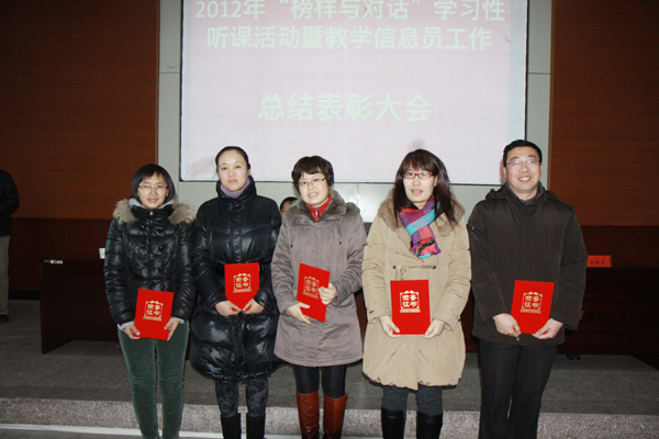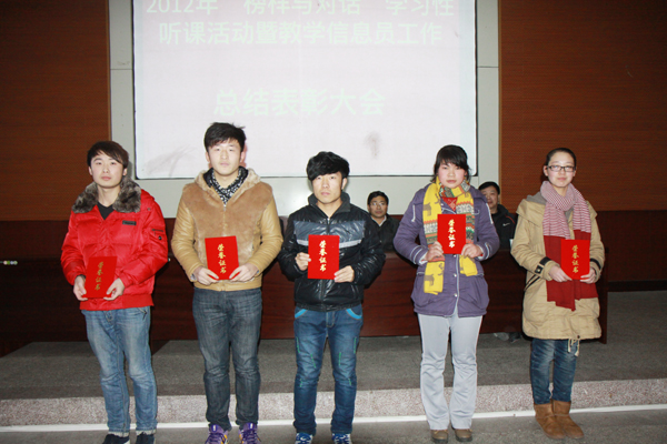 张登宏、沈士德等领导为在“榜样与对话·学习性听课”中的优秀主讲教师郭建萍、姜艳霞、苏长满、赵炜和孟春芳等老师以及优秀教学信息员颁发证书。优秀信息员代表陈加亮同学在会上进行了发言。(质考办 赖洁)