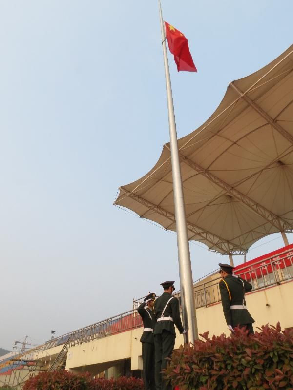 早上6:30,由数十名学生组成的国旗班,首次着新款制式军礼服,整齐划一,威武雄壮,护卫着鲜艳的五星红旗出场。全校青年学子和广大学生工作者,在激昂嘹亮的国歌声中,目送着国旗冉冉升起。