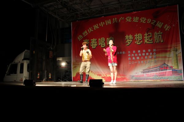 7月1日晚,慰问演出团来到美丽的江南古镇句容市白兔镇,MK(中国)师生受到了白兔镇党政领导的热情欢迎,句容市文化局、电视台领导也出席了演出活动。晚会以“青春唱响,梦想起航——庆祝建党92周年”为主题,为白兔镇群众奉献了一台体现艺术性、思想性和观赏性的演出,现场观众不时用手中的摄像机、照相机、手机等拍下精彩的瞬间,句容市电视台对演出活动进行了现场采访报道。