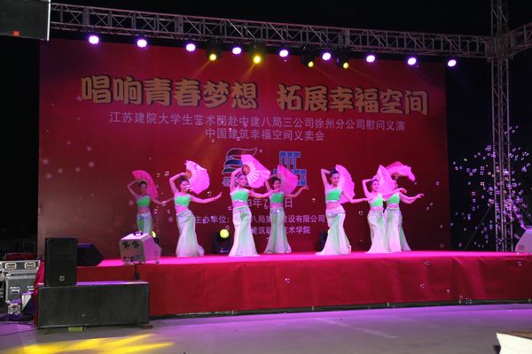 为了高质量完成本次慰问演出活动,大学生艺术团学生及指导老师进行了近一个月的精心排练。6月30日晚,慰问演出团首先来到龙信建设集团南京华润城项目工地,近千名建筑工人早已来到演出现场翘首期盼演出开始。在以“相约龙信,共筑梦想”为主题的近两个小时的演出中,现代舞、民族舞、街舞、民乐、现代乐、独唱、合唱、小品及现场互动等节目内容丰富,精彩纷呈,赢得了建筑工人的阵阵掌声和欢呼。艺术团大学生所迸发的青春活力和建设者的饱满热情,使现场气氛高潮迭起,热情激昂。