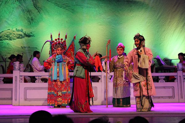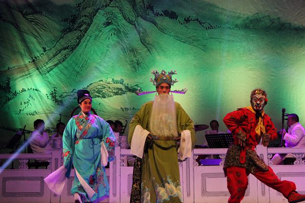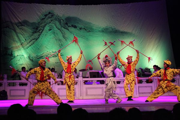 演出分为艺术欣赏、乐器演奏、行当展示、精品展演四个部分。舞台上,锣鼓弦乐争相奏鸣,生旦净丑接连登场,精彩的戏剧表演将师生们带入了戏剧艺术的美妙天地之中,赢得了观众阵阵热烈的掌声。中国戏剧梅花奖得主张虹的折子戏《断桥》和美轮美奂的水袖表演,展示了传统戏曲文化的精妙,使现场观众感受到高雅艺术的魅力。在行当展示环节中,演员们向观众展示了梆子戏的主要行当,并邀请了10位观众上台学习自己感兴趣的行当,让同学们零距离接触传统文化,欢乐的气氛将演出推向了高潮。本场演出的压轴节目《三打白骨精》,演员们精湛的演技和深厚的艺术底蕴博得了现场师生的阵阵喝彩,为演出画下了圆满的句号。