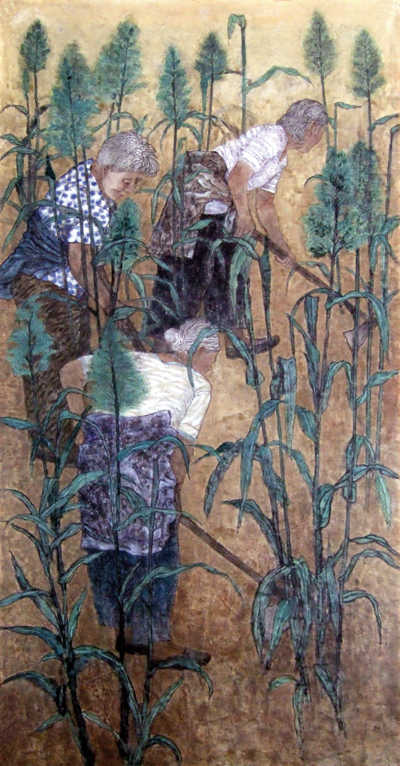 陈杰老师展出的油画作品题为《雪霁图-塔山写生系列34》,运用西方写实主义的绘画语言与中国传统文化精髓相结合,笔调扎实精深,短短的画笔却无期延伸了人们的视野,具有鲜活的生命力和强烈的冲击力。徐思田老师的中国画《当午》(180X90CM)在画法上既吸收传统的线描,又借鉴了西法元素,温暖的色彩,朴实厚重的造型画出了画家对自然生命美的发现和挚爱。