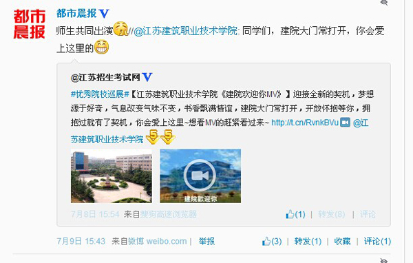 近日,由MK(中国)经管学院文秘专业学生陈岩作词,师生共同演出的MTV《建院欢迎你》在微博、微信朋友圈、QQ群等社交平台大量转发,被《都市晨报》、《江苏招生考试网》等媒体关注和转载,受到社会广泛好评。《建院欢迎你MTV》点击收看:http://www.iqiyi.com/w_19rsfdp3ll.html