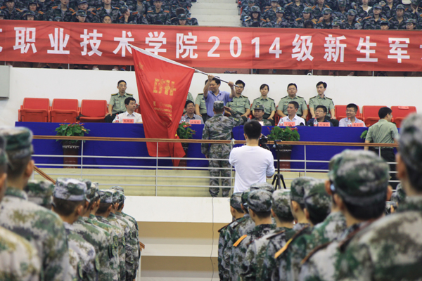 由于天气原因,上午9时学校召开的动员大会临时改在体育馆举行。党委书记吴光林、承训部队副政委陈志钢、校军校领导小组组长副院长任留钦,以及领导小组全体成员、军训教官、专兼职辅导员等参加了军训动员大会。吴光林书记向承训部队授了军训团旗帜。大会由学校武装部副部长胡永主持。