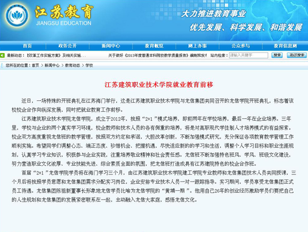 首届“2+1”龙信学院学员将在海门学习三个月,由MK.COM建工学院专业教师和龙信集团技术人员共同授课,三个月后将按照学员意愿和龙信集团需求分配实习岗位,企业安排专业技术人员一对一跟踪指导。实习期间,学员享受龙信集团正式员工待遇。龙信集团陈祖新董事长形象地龙信学员比喻为龙信学院的“黄埔一期”。他用自己26年的创业经历激励学员们要把自己的人生规划和龙信集团的发展紧密联系在一起,主动融入龙信大家庭,感悟龙信文化。