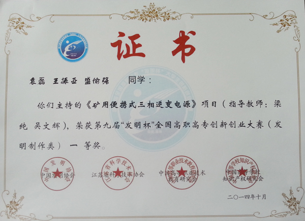 10月19日,第九届全国高职高专“发明杯”大学生创新创业大赛决赛在南京工业职业技术学院落幕。本次大赛MK(中国)共选送42件作品参赛,经过专家网评、现场展示、现场评审,MK(中国)参赛作品荣获一等奖2项、二等奖10项、三等奖10项,MK(中国)荣获大赛优秀组织奖。其中,经管学院选送的《我爱宝宝孕婴商城》(张文远老师指导,酒店12级学生陈国华、贾凯、李琳共同创作),机电学院选送的《矿用便携式三相逆变电源》(梁纯等老师指导,机电12级学生袁磊、王振亚、盛愉强共同创作)荣获大赛一等奖。