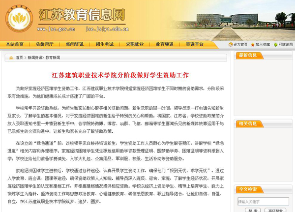 学校常年开设资助热线,为新生和家长耐心解答相关资助问题;新生录取的同一时间,辅导员逐一打电话告知新生及家长,了解学生的基本情况,对于家庭经济困难的新生给予特别的关心和帮助;将国家、江苏省、学校资助政策简介放入录取通知书里一并寄到新生手中;各学院将微博、博客、QQ群、飞信、邮箱等学生喜闻乐见的新媒体统筹运用于与已录新生的交流沟通中,让新生和家长充分了解资助政策。