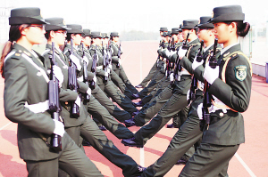 “齐步走”、“正步走”、“立正”、“敬礼”、“持枪”……在班长焦世鹏响亮有力的口令声中,国旗班的姑娘们有条不紊地训练着。迎着朝阳,踏着整齐的步伐,她们神情庄重,精神抖擞,既绽放着女孩子的青春与美丽,又展现了“巾帼不让须眉”的刚强和力量。