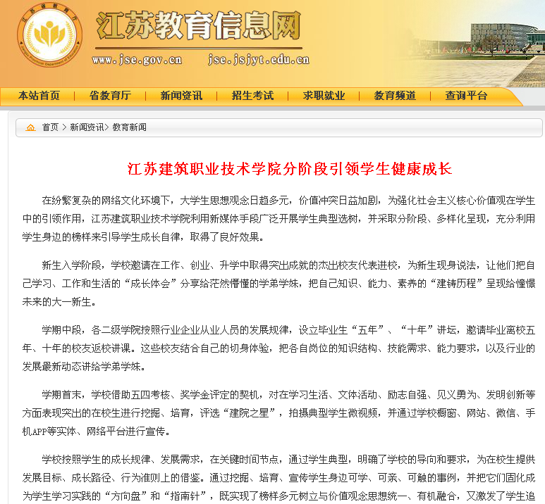 近日,江苏教育信息网以《MK.COM分阶段引领学生健康成长》为题,报道了MK(中国)在纷繁复杂的网络文化环境下,利用校友资源分阶段实施学生教育,引领学生健康成长的做法。