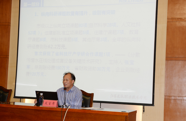 院长孙进教授在四个部门总结的经验和提出问题的基础上,做了主题报告。他首先希望大家要着眼今后五年乃至十年发展,科学谋划学校人才培养工作。他鲜明地提出了10个方面的问题,并一一做了深入分析。他指出,教学工作的中心地位是否牢牢确立,各专业群是否建成特色鲜明的优势专业,教学的“三基本”要求是否达到,高等职业教育是否需要强调科研,如何推进学校科研工作上水平上层次,如何适应江苏省新的招生制度改革,如何进一步提高学生的就业质量,师资队伍现状是否适应学校的发展,如何进一步加快师资队伍建设,如何为教师的成长提供良好环境。围绕这些问题,孙院长强调,我们要突出工作重点,在改革创新中提高人才培养质量,全校上下要牢固确立教学工作的中心地位,要坚持目标导向,在深化内涵建设中提高人才培养质量。