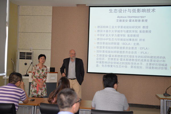 艾德里安·霍本斯德教授首先对自己从业经验及相关项目做了简要的介绍,并与我院老师进行互动。之后,在其学术讲座中,艾德里安教授根据德国可再生能源应用发展给大地景观带来的新问题,从大地景观低影响技术角度,分析了可再生能源设施的生态设计与安装方法,并介绍了在能源改革时期德国景观生态设计的经验。报告内容新颖而丰富,具有较高的学术价值和现实意义,使老师们开阔了学术视野,激发了学术研究的热情。