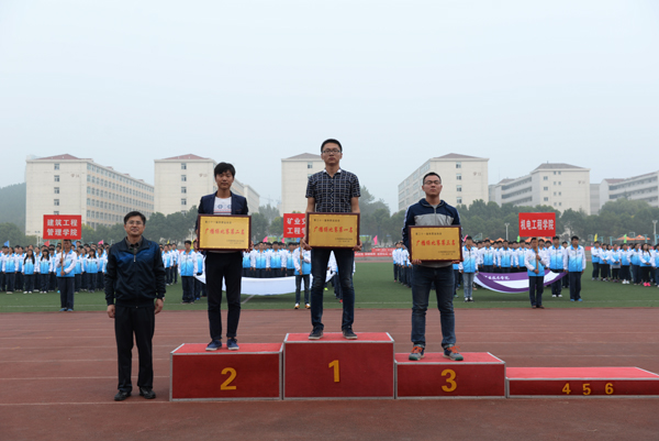 在教职工广播操比赛中机关党总支、机电学院党总支、设备学院党总支获得前三名,在学生广播操比赛中建工学院、设备学院、机电学院分获一、二、三名。建工15-10班、室设15-1班等20个班级被授予“精神文明班级”荣誉称号,传媒学院、机电学院、经管学院、建工学院荣获本届运动会“体育道德风尚奖”。