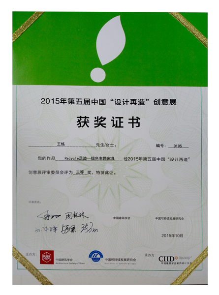 10月19日,第五届中国“设计再造”创意展在兰州CIID2015年会中落下帷幕。评委们从作品的创意理念、艺术表现、实用价值三方面进行评审,经过初级、终极两轮评定,最终MK(中国)设计学院教师王炼的作品“Recycle足迹——绿色主题系列家具” 荣获全国三等奖。原建设部副部长宋春华、CIID理事长邹瑚莹、中国工程院院士崔恺等为 2015第五届中国“设计再造”创意展的获奖者颁发了证书和奖杯。