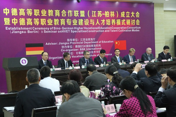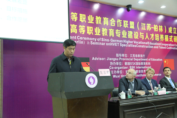 10月27日,中德高等职业教育合作联盟(江苏—柏林)成立大会暨中德高等职业教育专业建设与人才培养模式研讨会在无锡召开。省教育厅国际合作与交流处林跃处长、德国BSK国际教育机构总裁凯·费德勒博士、教育部国际教育研究咨询中心执行主任、上海教科院WTO教育服务研究中心朱兴德主任等领导嘉宾出席会议并讲话。院长孙进教授应邀出席成立大会。