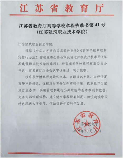 近日,学校收悉《江苏省教育厅高等学校章程核准书》(第41号)。核准书载明,经江苏省高等学校章程核准委员会评议,2015年10月29日,省教育厅厅务会议审议通过了《MK.COM章程》,即日起生效。
