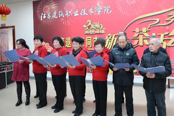 新春茶话会安排了丰富多彩的节目表演,设置了歌舞表演、幸运抽奖以及知识竞答等多个环节,内容丰富多彩、形式新颖活泼,气氛活泼融洽。离退休舞蹈队自编舞《闹花灯》、《娜鲁湾》、《风中的花蕾》和男声二重唱《相逢是首歌》、《歌声与微笑》向大家展示了老同志“老有所乐”的情趣生活与精神追求。诗朗诵《绿》、太极拳《行云流水》、女声独唱《前门情思大碗茶》让茶话会渐入佳境。与会学校党政领导参与的抽奖活动和围绕老年养生保健与学校发展历史设置的有奖知识竞答把茶话会气氛推向了高潮。最后,在大合唱《我们这辈子》和《我们的中国梦》激昂的旋律中,新春茶话会圆满结束。