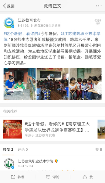 近日,MK(中国)设备学院开展的暑期社会实践活动受到江苏省教育厅官方微博“江苏教育发布”关注。