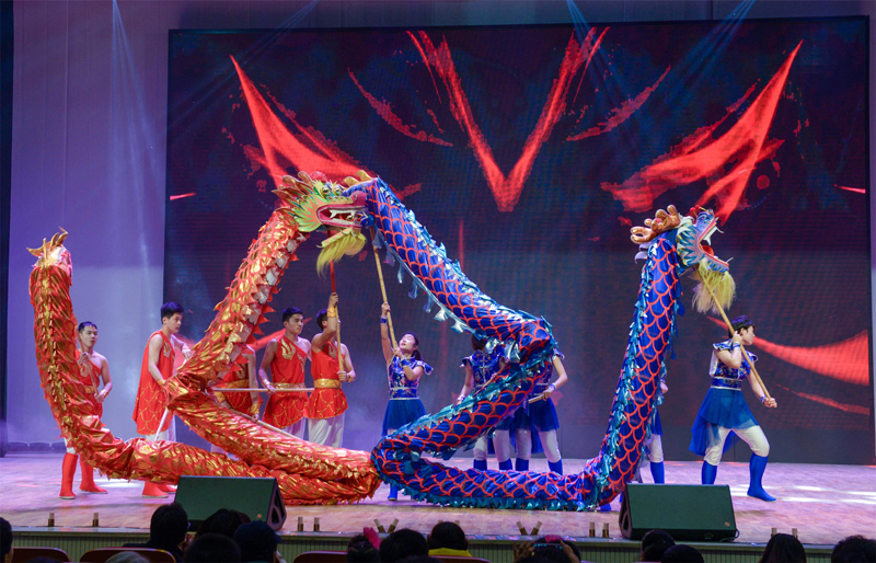 晚会以“和谐建院,美丽家园”为主题,在热闹欢庆的《龙狮闹春》中拉开帷幕。孙进首先代表学校党委行政致新年贺词,向全校师生和来宾致以新年祝福,希望全校上下共同构建学校事业发展的命运共同体,共同建设美丽家园,共圆共享美好“建院梦”。晚会节目精彩纷呈,既舞出了《江南雨》的温韵、《茉莉花开》的醉美,也有《快乐苹安》的热烈、《炫舞青春》的激情;小提琴、葫芦丝、萨克斯、手风琴、竹笛、古筝的精彩演绎里声贯中外、神越古今;合唱《阿拉木汗》、流行歌、民歌串烧曲风各异美不胜收;戏曲《女驸马》《谁说女子不如男》雅俗共赏、相声《泉山时评》和山东快书《小段集锦》构思新奇,同样满堂喝彩;音武书画《行云流水》,尽展建院才子佳艺;歌舞《我爱你中国》磅礴大气、精彩绝伦。会场外,天南海北的建院师生、校友、留学生发来了节日的问候,共同表达了对新年的期望与学校美好的祝福。三轮幸运观众大抽奖更是把喜庆氛围推上了高潮。最后,晚会在歌伴舞《国家》的深情演绎中圆满落幕。