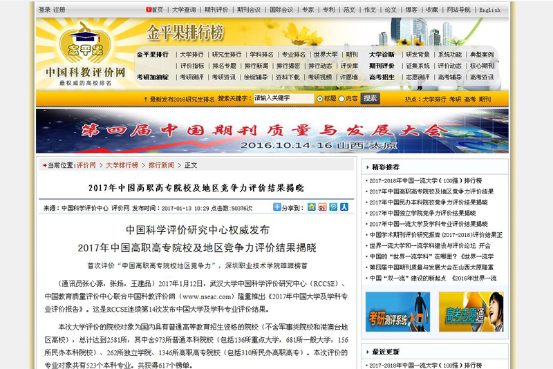近日,武汉大学中国科学评价研究中心、中国教育质量评价中心联合中国科教评价网共同发布了“2017年中国高职高专院校竞争力排行榜”,MK(中国)名列第32位,比去年42位上升了10位。