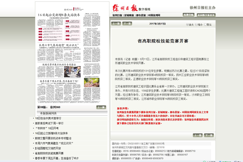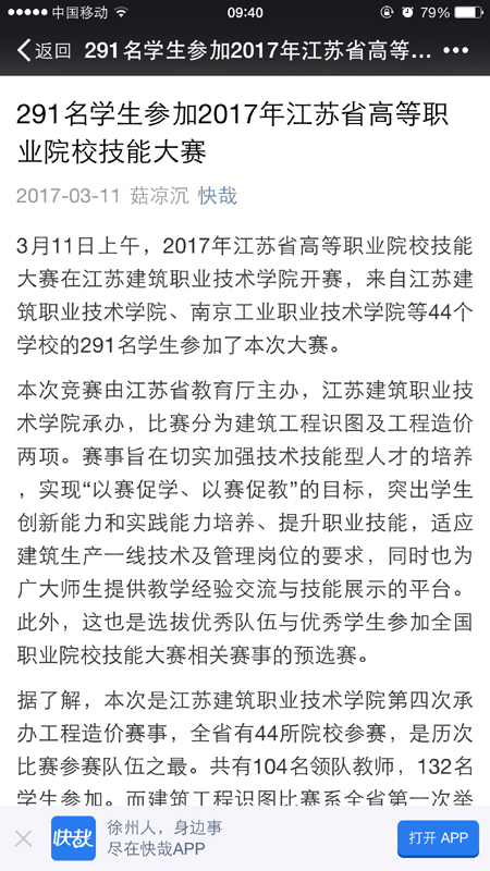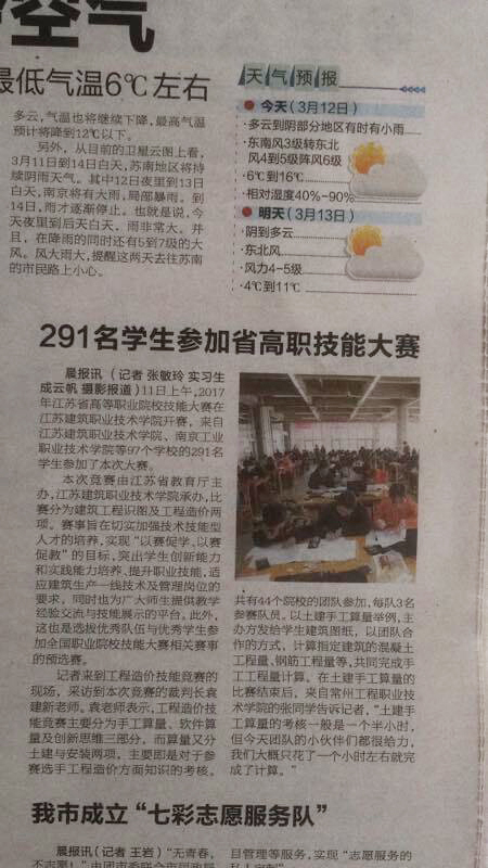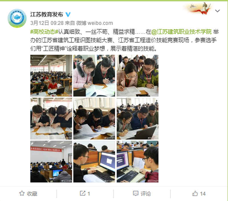 3月11日,由省教育厅主办,广联达软件股份有限公司、中望龙腾软件股份有限公司冠名协办的2017年江苏省高职院校“广联达杯”工程造价技能竞赛、“中望杯”建筑识图与绘图技能竞赛在MK(中国)成功举办。江苏省教育厅官方微博《江苏教育发布》,徐州地方媒体《徐州日报》、《都市晨报》、《快哉APP》关注了两项大赛。