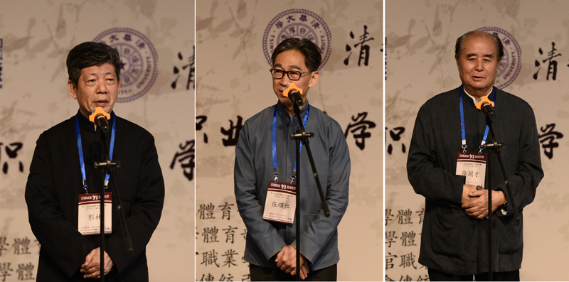从左至右:清华大学历史系教授彭林先生、嘉礼堂主人张颂仁先生、中国射箭协会传统弓分会荣誉主席、原国家射箭队总教练徐开才先生致辞。