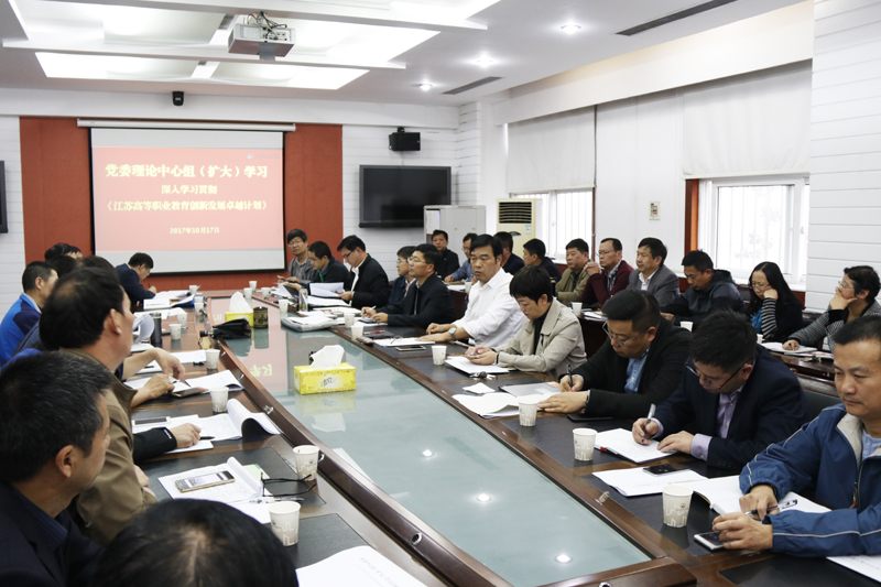 10月17日下午,学校党委理论学习中心组在视频会议室召开扩大会议,深入学习贯彻《江苏高等职业教育创新发展卓越计划》。校党委理论学习中心组成员、全体中层干部正职参加会议。会议由党委书记孙进教授主持。