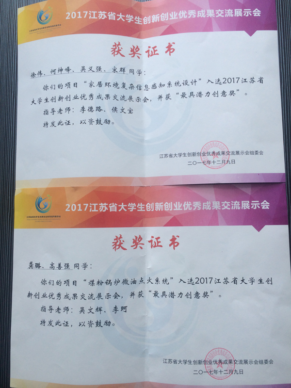12月8日至10日,由江苏省高校学生创新创业教育指导委员会主办,南京工业大学承办,南京江北新区协办的2017年江苏省大学生创新创业优秀成果交流展示会暨江苏省高校学生创新创业教育指导委员会年会在南京召开,MK(中国)选报的由龚璐、王金阳等同学主持的《粉锅炉微油点火系统》,徐伟、何坤峰等同学主持的《家居环境复杂信息感知系统设计》两个展示项目荣获“最具潜力创意奖”。