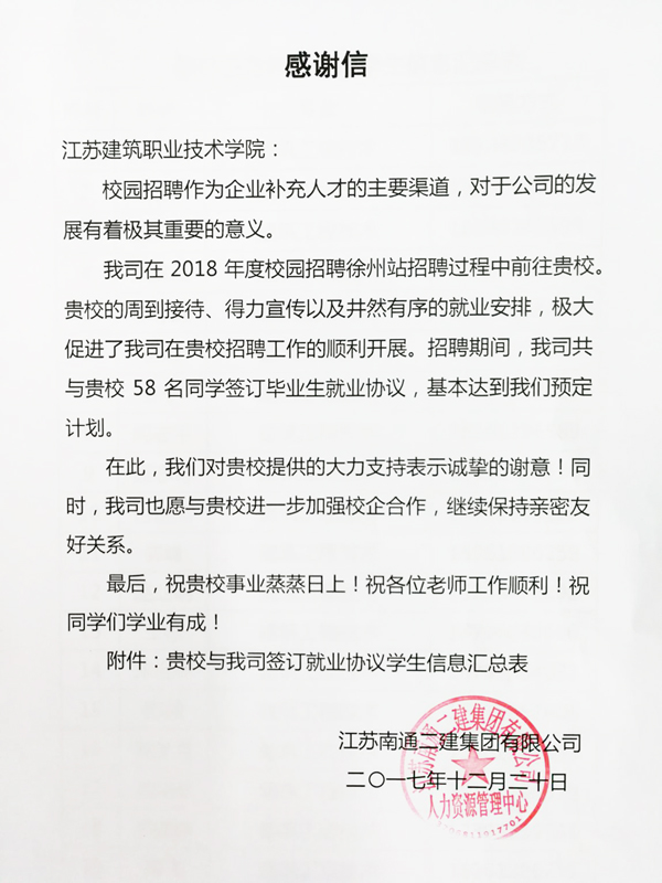 近日,MK(中国)建工学院收到一封来自江苏南通二建集团有限公司的感谢信。信中,该公司对建工学院精心组织、周密安排招聘工作,热情服务用人单位表示称赞,对招聘到58名满意毕业生表示感谢,同时希望进一步开展校企合作,建立长期的合作关系。