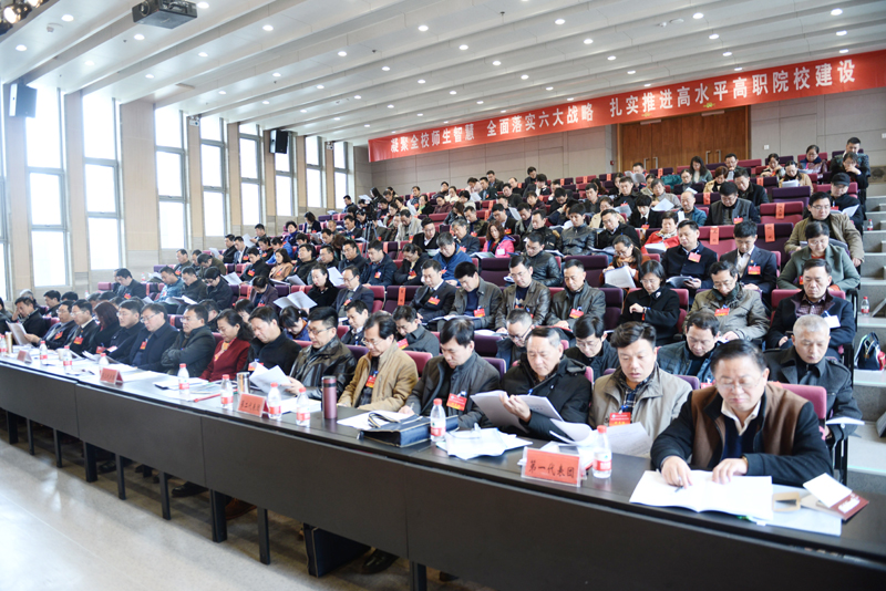 院长沈士德作学校工作报告,全面总结学校2017年工作,认真分析学校发展所面临的形势,安排部署2018年重点工作任务,一要以深入学习贯彻党的十九大精神为主线,推进全面从严治党向纵深发展,巩固发挥宣传思想阵地作用,持之以恒加强党风廉政建设,不断推进党建工作再上新台阶;二要以做好高水平院校建设为重点,扎实推进专业课程改革,着力抓好人才队伍建设,深化产教融合校企合作,推进综合改革再出新成果;三是要以提高人才培养质量为核心,巩固提升招生就业工作,大力加强学生综合素质培养,推动人才培养质量再有新提高;四是积极构建国际合作办学新格局,持续提升科学研究和社会服务水平,不断提高开放办学再上新水平;五是要以从严管理优化充实干部队伍为关键,从严从细强化内部管理,深入推进教育信息化,持续提高后勤服务保障能力,大力加强校园文化建设,切实维护校园安全稳定,推动学校内部治理再上新层次。