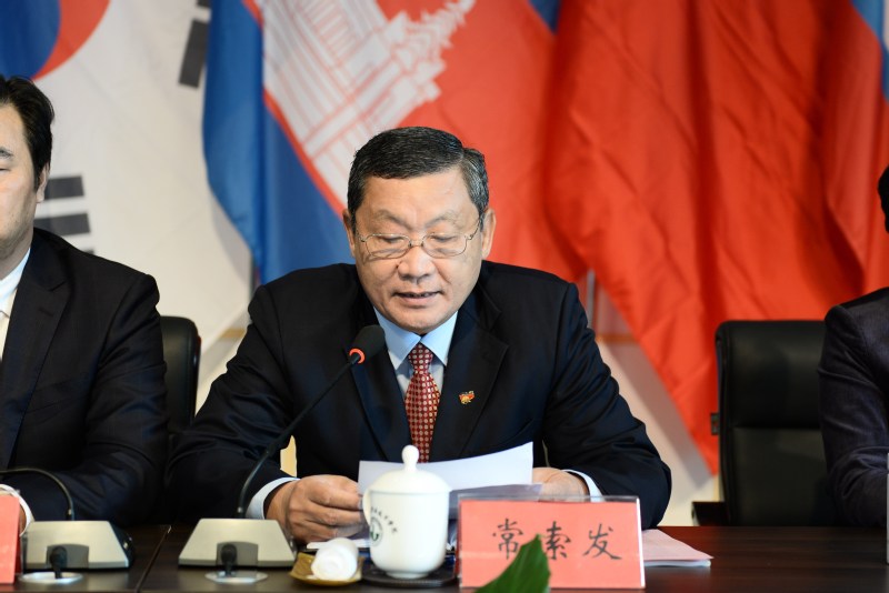 常索发主席发表致辞,介绍了马德望省教育和文化发展状况,期待马德望省和江苏省、徐州市在经济发展与教育文化方面有更多的交流合作,并祝福中柬友谊长青;同时感谢学校为柬埔寨来华留学生提供奖学金,勉励在校就读的柬埔寨留学生,要珍惜时间,奋发图强,遵守校规,努力学习中文和技术技能,学业有成,毕业后回国建设更加美丽的柬埔寨。