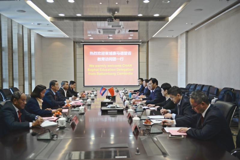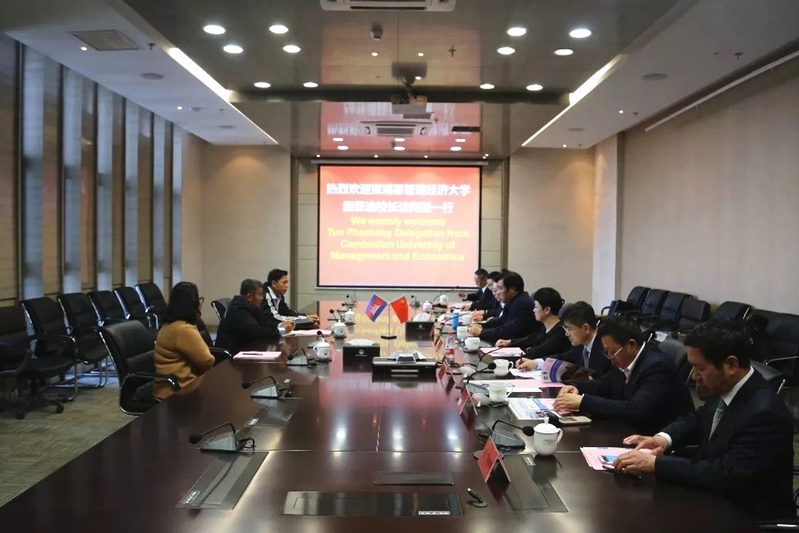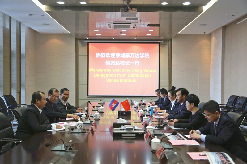 3月13日,柬埔寨马德望省人民党主席常索发、省宣传与教育部长额萨姆、省人民党常务委员森玛丽、省青年与体育教育部长尼塞特,柬埔寨万达学院校长恒万达,柬埔寨管理经济大学校长段菲迪等三个教育访问团来访。党委书记孙进代表学校对代表团组的到来表示热烈的欢迎并就双方合作事宜举行深入的洽谈。党委副书记梁惠、副院长曾凡远,教务处、学工处、经管学院、国际交流学院等单位负责人参加会谈。
