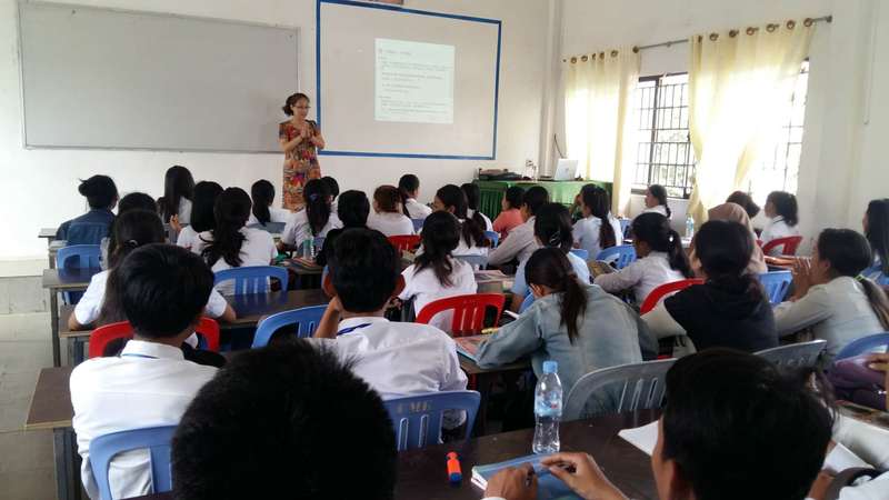 相比较老挝的小班课,柬埔寨管理经济大学的班级相对庞大,参加语言培训的都是在校的预科班学生,学习中文的热情高涨,课堂里50名学生是最小班,通常75名学生,最大的班级人数达到120人。校长助理禅熙女士解释说,学生学习汉语的高涨热情和积极性无法打击,他们提前调整了自己的专业课时间,专门留出学汉语的时间段,导致班级规模较大。