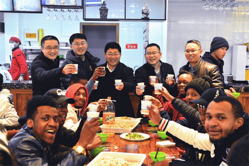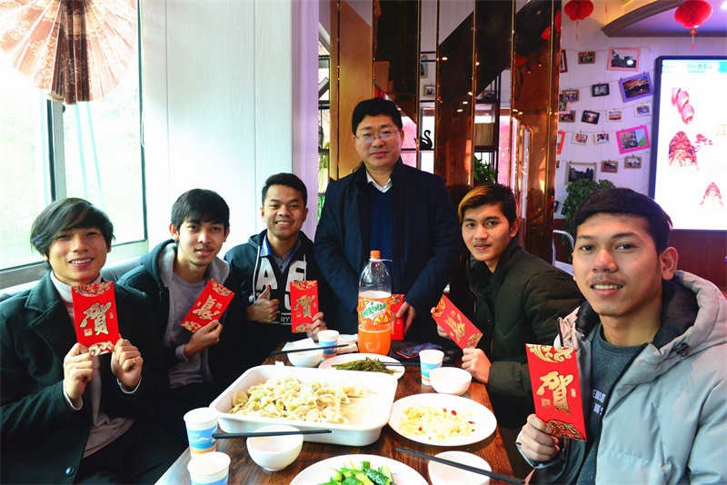 活动伊始,沈士德致新年贺词,他代表学校向全体留学生及其家人,以及全体工作人员拜年。席间,他为留学生与工作人员们发放红包,送上最美好的新春祝福,并亲切询问留学生寒假期间在校学习、生活情况,嘱托相关部门做好寒假留学生教育管理工作。吃着热气腾腾的饺子,远离家乡的留学生们亲身体验到了中国的春节文化,倍感校园的温暖。大家频频举杯互送祝福,争相合影留念,每个人都沉浸在浓浓的“年味儿”里。