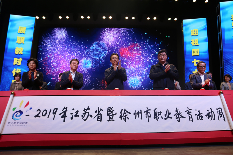 启动仪式在雄壮的国歌声中开始。葛道凯、徐开信、宋凯、倪阳生、李燕共同开启职教活动周画轴,启动2019年江苏省暨徐州市职业教育活动周。