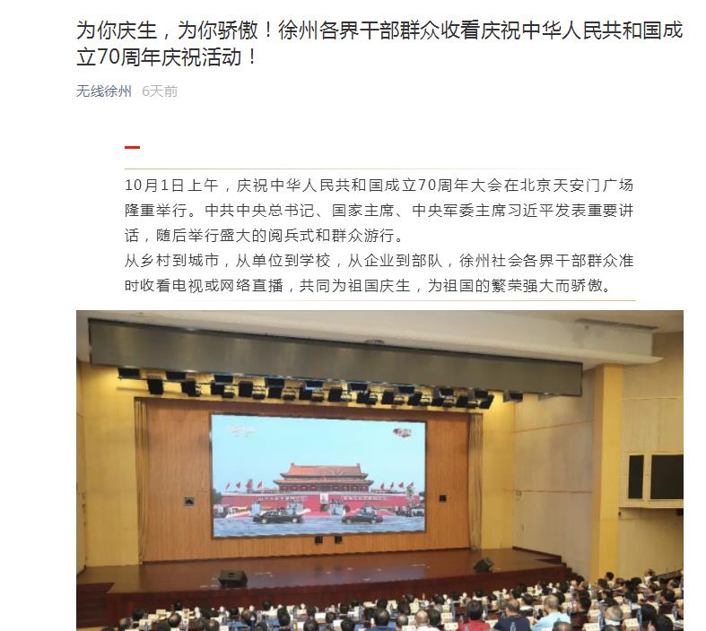 从乡村到城市,从单位到学校,从企业到部队,徐州社会各界干部群众准时收看电视或网络直播,共同为祖国庆生,为祖国的繁荣强大而骄傲。