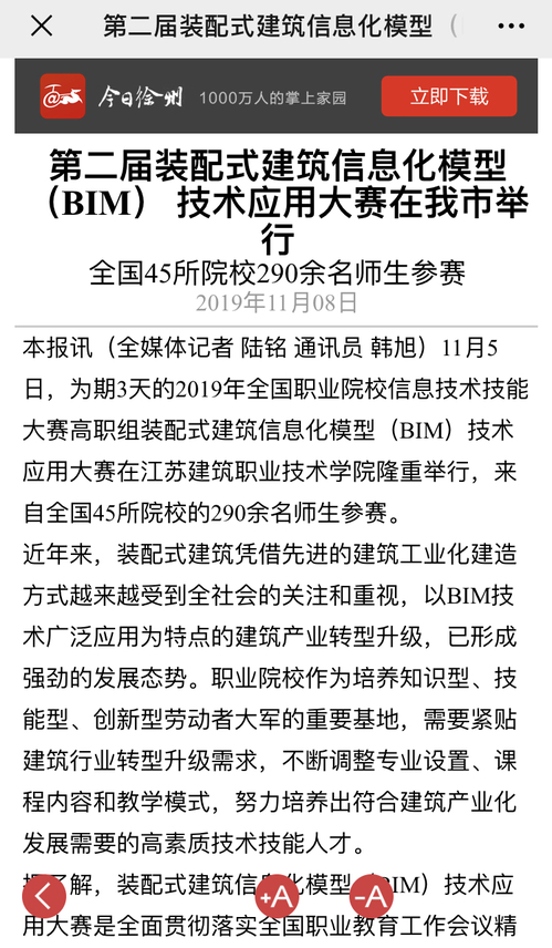 据了解,装配式建筑信息化模型(BIM)技术应用大赛是全面贯彻落实全国职业教育工作会议精神,推进高校BIM教学实践,加快BIM人才培养模式创新而举办的职业教育高端技能大赛。作为选拔优秀BIM技术应用人才的重要载体,大赛紧密贴合行业岗位需求和技术发展,坚持以赛促教、以赛促学,实现赛教双向融通,促进人才培养与产业岗位有效衔接,促成政、校、行、企共享共赢,大力推进建设专业化装配式建筑技术队伍和服务地方装配式建筑产业的发展。